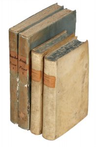 Legature coeve in pieno cartonato azzurro con titoli manoscritti su tassello cartaceo al dorso. Fori e lavori di tarlo ai contropiatti e alle sguardie, mancanze lungo le cerniere.