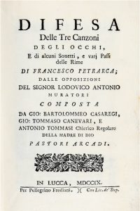 CASAREGI Giovanni Bartolomeo e altri, Difesa delle tre Canzoni degli occhi, e di alcuni sonetti, e vari passi delle Rime di Francesco Petrarca. In Lucca : per Pellegrino Frediani, 1709.