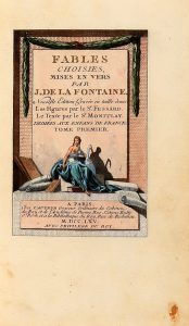 (Cohen-Ricci 551-552), uno dei più importanti libri illustrati del XVIII secolo e una delle più belle edizioni delle Favole di La Fontaine ; le splendide figure sono state incise in rame da Fessard da disegni di Bardin, Bidault, Caresme, Desrais, Houël, Kobell, Leclère, Leprince, Loutherbourg, Meyer et Monnet, il testo interamente inciso da Montulay e Drouët.