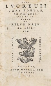 LUCRETIUS TITUS CARUS, De rerum natura libri sex. Lugduni : apud Haered. Seb. Gryphii, 1558.