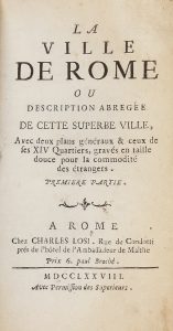 Rara guida di Roma del Magnan, ristampata dal Losi nello stesso anno della prima, pubblicata anonima a Roma da Arcangelo Casaletti nel 1778 prima in-8° e poi in una versione in-folio e distribuita a Saint Eustache da Bourchard e Gravier.