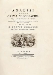 MOROZZO Giuseppe, Analisi della Carta Corografica del Patrimonio di S. Pietro corredata da alcune memorie storiche ed economiche. In Roma : nella Stamperia Giunchiana, 1791.