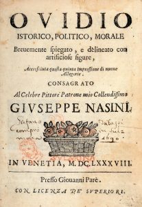 PALAZZI Giovanni, Ovidio istorico, politico, morale. Brevemente spiegato, e delineato con artificiose figure... In Venetia : Presso Giovanni Parè, 1688.
