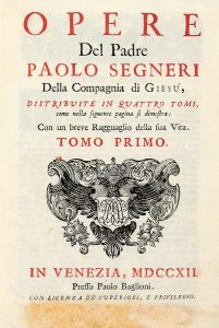 SEGNERI Paolo, Opere [...] distribuite in quattro tomi come nella seguente pagina si dimostra; con un breve ragguaglio sulla sua vita. Tomo primo (-quarto). In Venezia : presso Paolo Baglioni, 1712.
