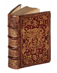 Legatura coeva alle armi in piena pelle, con due diversi stemmi sui piatti attorniati da ricca bordura con volute fogliate e anfore, gigli di Francia ai piccoli ferri e due leopardi rampanti, il tutto impresso in oro ; fregi floreali dorati al dorso a 4 nervi e tagli dorati e cesellati ; lo stemma con il castello turrito al piatto posteriore è stato apposto sopra una precedente iscrizione, parzialmente leggibile.