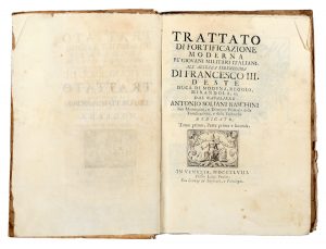 Prima edizione di questo importante trattato di fortificazione di Soliani Raschini, matematico ducale e direttore primario delle fortificazioni e delle fabbriche di Francesco III d'Este, di cui la terza parte non fu mai stampata.