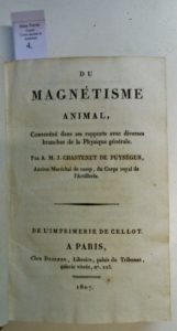 CHASTENET DE PUYSEGUR (A.M.J.) Du magnétisme animal... – Paris, Cellot, Desenne, 1807 – in-8 : [4], 478, [1] f. errata – demi-veau fauve, dos lisse orné, p. de titre rouge. (Dos frotté, petite fente à un mors). Exemplaire sans la gravure...