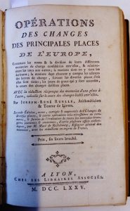 RUELLE (Joseph-René) Opérations des changes des principales places de l'Europe... 2e éd. – Lyon, Librairies associés, 1775 – in-8 : 444 p. – maroquin rouge ancien, fine roulette autour des plats, dos lisse orné, p. de titre noire. (sans le...