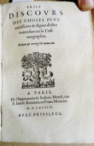 et de [GALARD-TERRAUBE (Guillaume de)] Brief discours des choses plus necessaires & dignes d'estre entendues en la cosmographie rev. & cor. – ibidem, 1568 – 20 f., [2 f. bl. ] en 1 volume vélin souple ancien à petit recouvrement, titre ms. au dos, traces de liens.