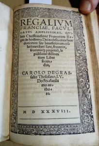 42 - GRASSAILLE (Charles de) Regalium Franciae libri duo, jura omnia & dignitates christianiss. Galliae regum continentes – Lyon, Simon Vincent, 1538 – 2 T. in-8 : [20], 322 p., [2] bl./ titre, 137, [5] p.; bois in-t. – basane ancienne, dos...