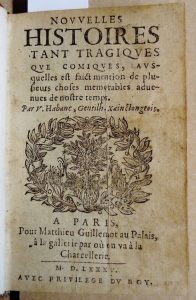 43 - HABANC (Vérité, gentilhomme xainctongeois) Nouvelles histoires tant tragiques que comiques, ausquelles est faict mention de plusieurs choses memorables advenues de notre temps – Paris, Matthieu Guillemot, 1585 – in-16 : [16] f., 272 f. –...