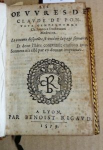 61 - PONTOUX (Claude de) Les Oeuvres de Claude Pontoux, gentilhomme chalonnois, docteur en médecine. Le contenu desquelles se void en la page suyvante. Et dont l'idée contenant environ 300 sonnets , a esté par cy devant imprimée – Lyon, Benoist...