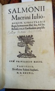 63 - SALMON (Jean) Salmonii Macrini Juliodunen. Cubicularii regii, hymnorum libri sex, ad Jo. Bellaium S.R.E. cardinalem ampliss. – Paris, Robert Estienne, 1537 – 238, [2] p. – suivi du même : Hymnorum selectorum libri tres. Ad illustrissimum...