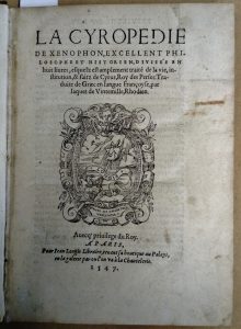 70 - XENOPHON La Cyropédie ..., divisée en huit livres, esquelz est amplement traité de la vie, institution, & faicts de Cyrus, roy des Perses : traduite de Graec (sic) en langue françoyse, par Jaques de Vintemille Rhodien – Paris, Jean Longis,...