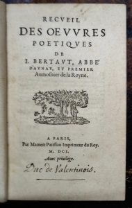 73 - BERTAUT (J.) Les oeuvres poétiques – Paris, Mamert Patisson, 1601 – in-16 : [2], 112 f. – veau ancien, dos lisse orné, p. de t. grenat, armes en queue. Ex-libris ms. au titre Duc de Valentinois. (f. 42 court de marge en queue, f. 47...