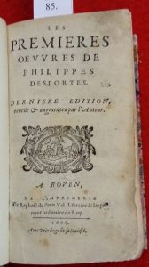 85 - DESPORTES (Philippe) Les premières oeuvres. dernière éd. aug. – Rouen, Raphaël du Petit Val, 1607 – in-12 : 675, [34] p. la dernière portant la marque d'imprimeur. – cartonnage postérieur papier marbré, dos lisse orné pastiche...