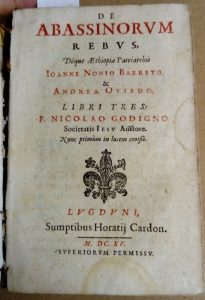 95 - GODIGNO (Nicolas, s.j.) De Abassinorum rebus, deque Aethiopiae Patriarchis Ioanne Nonio Barreto & Andrea Oviedo – Lyon, Horace Cardon, 1615 – in-8 : [16], 414 p. – parchemin ancien souple, plats colorés en jaune, titre ms. au dos....