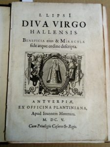 104 - LIPSE (Juste) Diva virgo hallensis beneficia eius & miracula fide atque ordine descripta – Anvers, Plantin, Jean Moretus, 1605 – in-4 : [8], 86, [10], 2 pl. ht (sacellum D. Virginis et Hallae oppidum) suivi de Diva Sichemiensis sive...