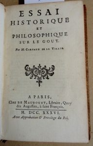 161 - CARTAUD DE LA VILATE Essai historique et philosophique sur le goût – Paris, de Maudouyt, 1736 – in-12 : [8], 330 p. – veau granité ancien, dos orné à nerfs. (mors fendu, largement frotté) Ex-libris Billoër.