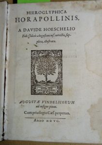 171 - HORAPPOLON Hieroglyphica horapollinis a Davide Hoeschelio fide codicis Augustani ms. correcta, suppleta, illustrata – Augsbourg, 1595 – in-4 : [8], 217 p. (numérotées 214), [11] p. – restes de reliure veau ancien. Texte en grec et latin...