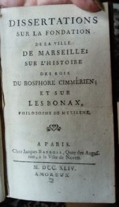 177 - MARSEILLE [CARY (Félix)] Dissertation sur la fondation de la ville de Marseille – Paris, Barrois, 1744 – in-12 : vi, 145, [3] p.; 2 fig. in-t. – veau granité ancien, dos orné à nerfs. (petite déch. sans manque en marge d'1 f., dos...