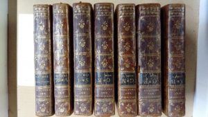 182 - [PARFAIT (Claude) et GODIN D’ABGUERBE] Dictionnaire des théâtres de Paris – Paris, Lambert, 1756 – 6 volumes in-12 et 1 additif – 7 volumes reliure uniforme veau marbré ancien, dos lisse orné. (dos frottés p. de titre verte et...