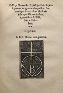 * [Post-incunable]. BEROALDO (Filippo). Libellus quo septem sapientum sententiae discutiuntur. [Au colophon :] Impressum Bononiae per Benedictum Hectoris Bibliopola[m] Bononiensem (i.e. Benedetto i Faelli), 1502. In-4, [24] f. [sign.A-C 8], marque de...