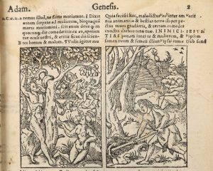 Intéressante édition lyonnaise sur 2 colonnes. Titre dans un bel encadrement gravé sur bois. L'illustration se compose de 171 vignettes d'un quart de page, certaines répétées, gravées sur bois. Quelques-unes de ces images dérivent de compositions de Hans Holbein ; la plupart de celle ornant l'Ancien Testament prennent principalement pour modèle une suite composée par Hans Sebald Beham.