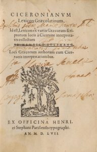 * [Livre du XVIe siècle]. ESTIENNE (Henri) ; CICÉRON. Ciceronianum lexicon graecolatinum, id est lexicon ex variis graecorum scriptorum locis a Cicerone interpretatis, collectum ab Henrico Stephano. Loci graecorum authorum cum Ciceronis...