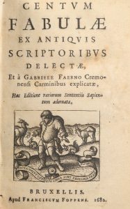 * FAERNO (Gabriele). Centum fabulae ex antiquis scriptoribus delectae. Bruxellis, apud F. Foppens, 1682. In-8, [8] f., 200 p., [4] f. (le dernier blanc), 100 vignettes dans le texte, reliure époque veau havane, dos à 5 nerfs, pièce de titre basane...
