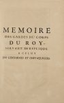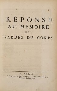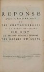 [Pour la compagnie des gardes du corps, défendant ses privilèges contre les gendarmes et les chevau-légers de la garde ordinaire du roi, à l'occasion du sacre de Louis XV.] Delespinne, 1724. In-folio, 16 p. (sans page de titre). - 2. Réponse au Mémoire des gardes du corps. Coignard, 1724. In-folio, [1] f., 22 p. - 3. Mémoire des gardes du corps du roy, servant de réplique à celuy des gendarmes et chevau-légers. Delespinne, 1724. In-folio, 25 p. - 4. Réponse des gendarmes et des chevaux-légers de la garde ordinaire du roy, au second mémoire imprimé des gardes du corps. Coignard, [1724]. In-folio, 26 p. - 5. Reglement du roy, sur les places que doivent occuper les officiers des troupes de sa maison, près du carrosse de Sa Majesté, dans ses voyages. Du 11 Novembre 1724. Imprimerie royale, 1724. In-4, 4 p.