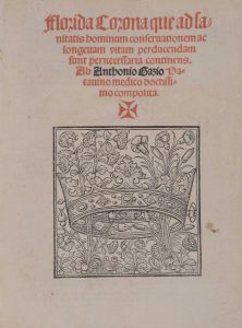[Post-incunable]. GAZIO (Antonio). Florida Corona que ad sanitatis hominum conseruatione ac longeuam vitam perducendam sunt pernecessaria continens. [Au colophon] : Impressum Lugd. per Gilbertum de villiers impensis Bartholomei Trot, 1514. In-8,...