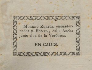 Étiquette du relieur et libraire de Cadix Moreno Zurita, au contreplat supérieur. Il est probablement l'auteur de cette reliure.