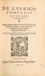 * [NANTIER (Simon)]. De lubrico temporis (ut vocant) curriculo. Déque hominis miseria Opusculum, cum commento familiari. Lugduni, apud B. Rigaudum, 1570. In-8, 44 p., [2] f., (sign. A-C 8), marques au titre et au v° du dernier f., bandeaux et...