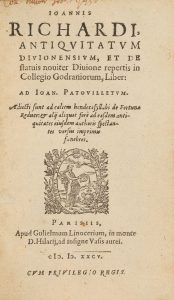 * RICHARD (Jean). Antiquitatum divionensium, et de statuis noviter Divione repertis in Collegio Godraniorum, liber Parisiis, apud G. Linocerium, 1585. In-8, [7]-48 f. [sign. a7, A-F8], bandeau répété, 2 lettrines, 4 vignettes dans le texte, le...