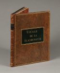 planches, veau raciné époque, dos lisse, pièce de titre maroquin noir, roulettes et fleurons dorés, grande pièce de titre maroquin vert foncé au plat supérieur, les 2 plats encadrés d'une roulette dorée, filet doré aux coupes, roulette bordant les contreplats (frottements négligeables, rares rousseurs, bruniss. en marge des 2 dernières pl.).