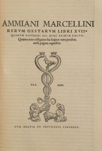 Exemplaire réglé, avec annotations anciennes soignées en marge, dont des manicules ; ex-libris manuscrit biffé en tête du titre ; ex-libris moderne à sec de Lud. ducis Blacacii de Alps ; la partie concernant Ammien Marcellin est précédée d'un titre particulier page 545.