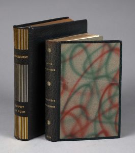 - FALKÉ. CHARDOUNE (Louis). Le pot au noir. Scènes et figures des tropiques. Paris, Mornay, 1922. Petit in-4, maroquin vert foncé, dos lisse orné d'une composition de filets verticaux à l'or et au palladium, auteur et titre doré, contreplats doublés de box orangé, doubles gardes de satin et de papier marbré, couverture et dos conservés (légers frott. sur 2 coupes).