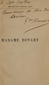 Envoi autographe signé de Gustave Flaubert " à Me Motte / Hommage de son tou[t] / dévoué ". (en fin de ligne, les deux lettres " t ", de " tout " et " Flaubert " coupées par le relieur).