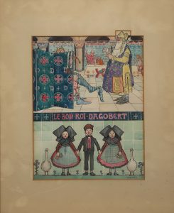 parties, destinée à illustrer la célèbre chanson. Dans la moitié haute est représenté saint Eloi, et l'on devine derrière un paravent le roi Dagobert remettant ses chausses en bon ordre. On voit dans la partie basse trois enfants en costume alsacien, chantant, encadrés de deux oies.