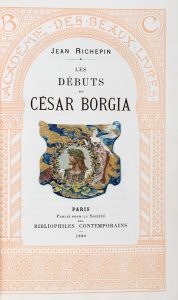 ROCHEGROSSE. RICHEPIN (Jean). Les débuts de César Borgia. Paris, Société des Bibliophiles contemporains, 1890. Grand in-8, maroquin prune, dos à 5 nerfs saillants oréns d'un pointillé doré, auteur, titre et date dorés, caissons finement...