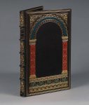 ornés et mosaïqués, chaque plat encadré d'une large composition architecturale à l'or et mosaïquée, double filet doré aux coupes, contreplats doublé de maroquin et richement décorés d'encadrements multiples avec fleurons angulaires, doubles gardes de satin et papier marbré, tranches dorées, couverture et dos conservés, étui assorti [Visinand].