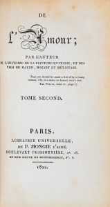 [STENDHAL (Henri Beyle, dit)]. De l'amour. Par l'auteur de l'Histoire de la peinture en Italie, et des vies de Haydn, Mozart et Métastase. Paris, Librairie universelle de P. Mongie l'aîné, 1822. Deux tomes en 1 vol. in-12, reliure fin XIXe s....