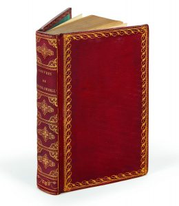 Maroquin rouge à long grain, roulette dorée en bordure des plats, dos lisse orné, roulette dorée intérieure, gardes de tabis bleu, tranches dorées (reliure du début du XIXe siècle).