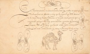 Intéressant cahier d'écriture du XVIIe ou du XVIIIe siècle, proposant la copie de 8 maximes en français et espagnol, en lettres rondes ou bâtardes, entourées de «monocondyles» géométriques ou représentant des animaux (oiseaux, dromadaire, cheval, loup, cerf ).