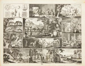 Les 52 gravures numérotées représentent plusieurs compartiments proposant des fables mais également des scènes mythologiques, historiques, bibliques, et des schémas scientifiques.
