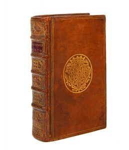Veau blond, double fi let doré en encadrement et armes dorées au centre sur les plats, dos à nerfs richement orné de fl eurons et piè ces d'armes alterné es dorées, roulette dorée intérieure, tranches rouges (reliure de l' époque).