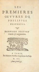 DESPORTES (Philippe). Les Premières oeuvres de Philippes Des-portes. Paris : Mamert Patisson, 1600. — In-8, 159 x 99 : (8 ff.), 338 ff., (6 ff.).