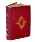 Maroquin rouge, large fleuron central losangé avec motif à entrelacs doré au centre sur les plats, dos à nerfs orné, dentelle dorée intérieure, tranches dorées sur marbrure (Trautz-Bauzonnet).