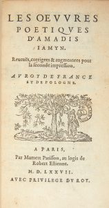 JAMYN (Amadis). Les OEuvres poétiques d'Amadis Iamyn. Reveuës, corrigees & augmentees pour la seconde impression. Paris : Mamert Patisson, 1577. — In-12, 133 x 78 : (4 ff.), 308 ff., (12 ff. dernier blanc).